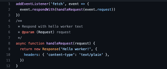 In the `Index.js` file below you will find a default serverless function that adds an eventListener to the DOM for an event and on line 9 you can see the response to the request is to return “Hello worker” to the DOM as type text/plain. You can also return a text/html in the header. We will see this later on in this tutorial.